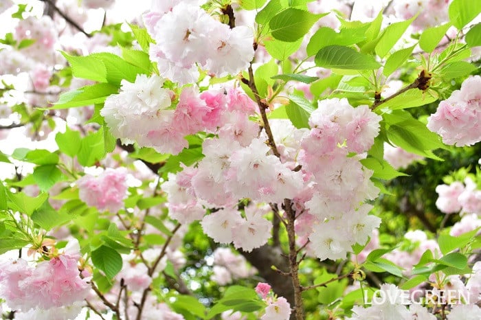 八重桜には多くの品種が存在します。色は淡いピンクから濃いピンクをはじめ、白や緑色もあります。