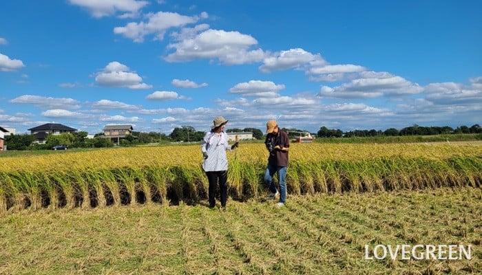 お正月飾りには8月ころに青田刈りをした青い藁を使っています。通常の藁と比較すると丈が長く、また通常の藁よりも細いのが特徴です。専用の田圃が2反ほどあり、来年用にもみを収穫する分を残して、藁が青い状態で収穫を行います。通常日本で生産されている稲は70cm~1m程度の長さですが、この稲は120cmほどありました。昔はこれぐらいの丈の稲が一般的だったそうですが、現在は改良が進んで背丈が短い稲が一般的になったんだそうです。