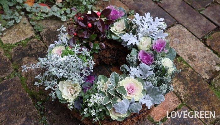 ホワイトグリーン系のハボタンをメインに、ペールトーンの草花を集めてリースを作りました。クリスマスが終わったら和風の飾りに付け替えると、お正月も華やかに演出できます。