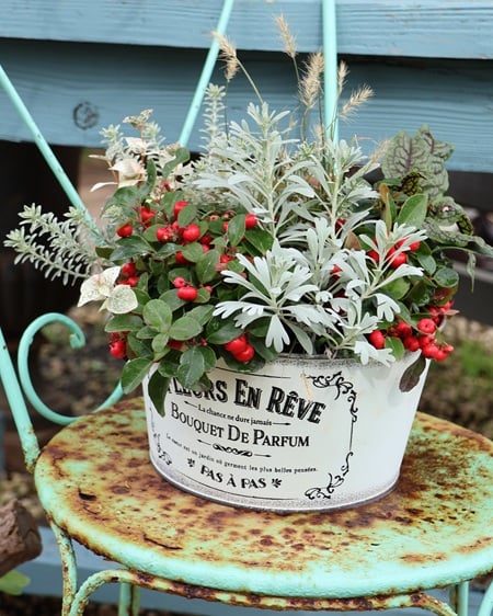 チェッカーベリーをふんだんに使い、シルバーリーフと合わせたラブリーな寄せ植え。ルメックスやイネ科の穂をアクセントに使っていてとても素敵です。