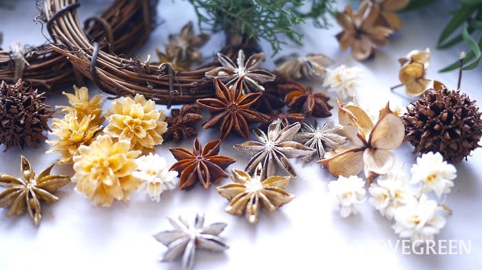 ただし、1つポイントがあります。ヘクソカズラは草でツルの強度は弱いので、他の素材をつける場合は、軽い素材に限ります。重たい実などを入れると、リースが歪んで丸に見えなくなってしまいます。