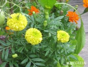 写真は、マリーゴールドとトマトなどの寄せ植えです。黄色いマリーゴールドはアフリカン、オレンジ色のマリーゴールドはフレンチです。