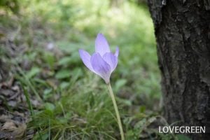 コルチカムは、イヌサフラン科の球根植物。秋に淡い紫色の花を咲かせます。園芸品種には、花が大ぶりなものや、八重咲きなど、華やかな品種がたくさんあります。