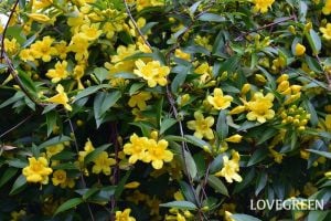 カロライナジャスミンは春に明るい黄色の花を咲かせるつる植物。辺りいっぱいに甘い香りを漂わせます。
