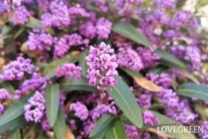ハーデンベルギアは藤を小さくしたような紫色の花が美しいつる植物。2月の後半から咲き始めます。