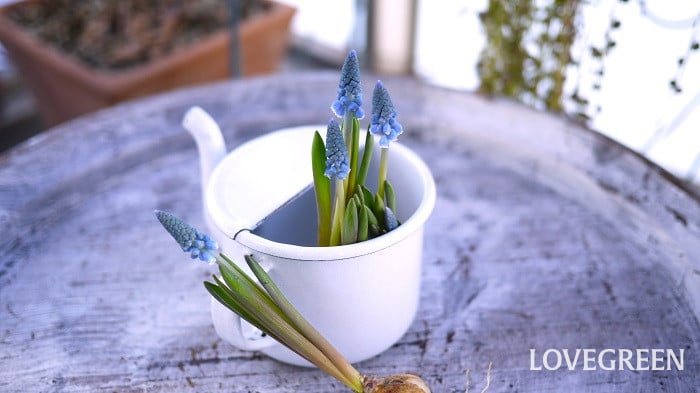 秋には球根の状態で販売され、2月頃には芽を出した「芽出し球根」の苗が出回ります。また、最近は切り花として、球根がついた状態のムスカリが花屋さんで売られています。