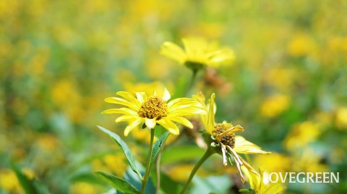 キバナコスモスは、黄色や赤、オレンジの花を咲かせます。コスモスに似ていますが、正確には別種です。