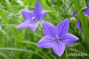 キキョウは、夏から秋にかけて花を咲かせます。一重咲きから八重咲きまであり、花色も青紫の他、白やピンク、ベージュピンクなど多様です。
