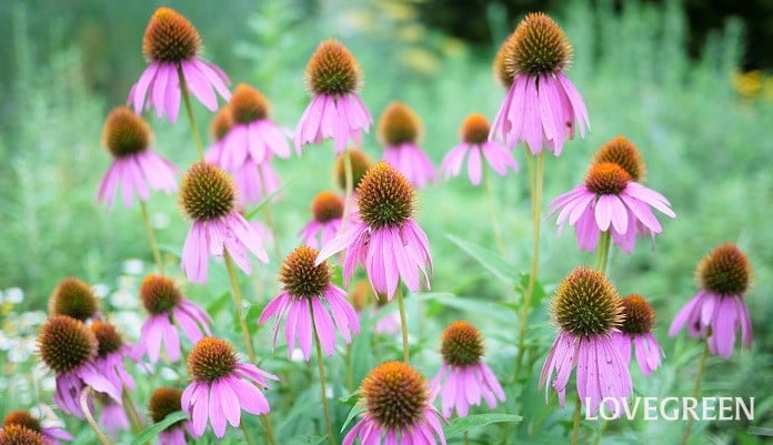 エキナセアは、大きく印象的な花を咲かせるキク科の多年草です。こんもりと盛り上がった花芯のフォルムが独特で目を引きます。
