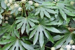 ヤツデは大きな手のひらのような形の葉が印象的な常緑低木。日陰でもよく育つことから、シェードガーデンで活躍します。初夏に黒く熟す実も特徴的で、和の庭から洋の庭まで活躍します。
