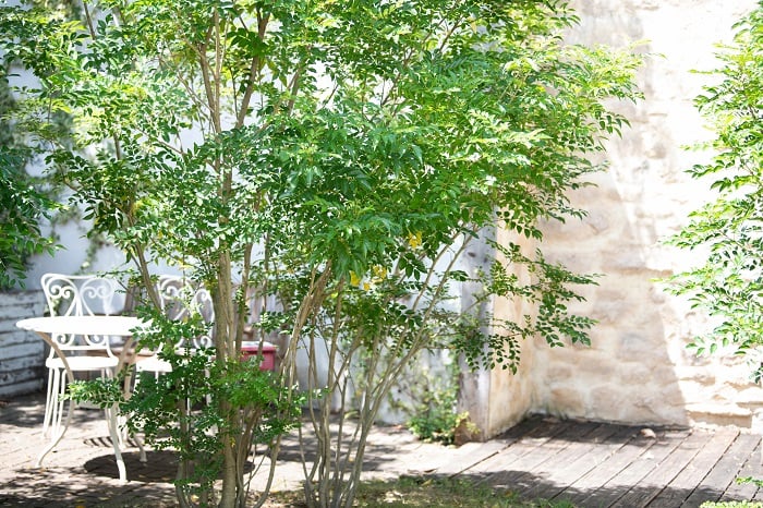 ソヨゴは葉の密度が高く、樹高も3m以上と大きいので、目隠しとして活躍してくれる庭木の一つです。葉の密度が高いといっても、びっしりと空間を埋めてしまうような樹形ではないので、枝の間から風が抜ける柔らかな雰囲気も楽しめます。