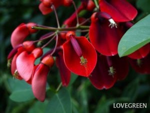 アメリカデイゴは、マメ科の落葉高木。夏に真赤な花を咲かせます。熱帯地方原産の花木で、温暖な地域では屋外で越冬が可能です。地植えにするととても大きくなります。