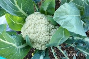 上の画像のように葉を折って、カリフラワーを白く保ちましょう。
