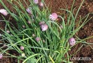 チャイブは、ネギの仲間のハーブ。5月~7月に写真のようなボール状の花がたくさん開花します。草丈が低いので鉢植えでも地植えでも育てることができます。