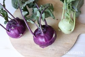コールラビは、キャベツ、ブロッコリー、ケールなどと同じ仲間です。丸くコロンとした形が可愛らしく、育つ姿を見るとほっこりします。球の横から出た葉は2~3cm残して切り取り、球の肥大をうながしましょう。球径が7~8cmくらいになったら根元から引き抜いて収穫します。