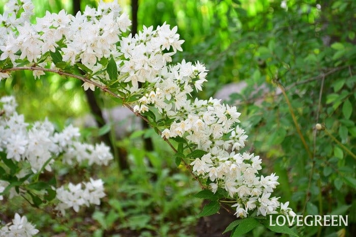 アジサイ科バイカウツギ属。梅に似ている花を咲かせ、枝葉の特徴はウツギに似ている。