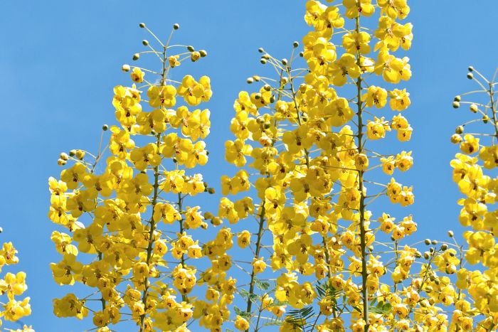 ジャケツイバラ(蛇結茨)はマメ科のつる性落葉低木。初夏に黄色い花を咲かせます。小さな花(直径2㎝ほど)が集まって長さ20~30㎝の花房になり、上向きに咲きます。ジャケツイバラ(蛇結茨)の葉は、小判型をした羽根のような形で明るい緑色をしています。軸の両側に向かい合うように小葉が5~10枚ついています。葉の数は偶数です。ジャケツイバラ(蛇結茨)のツルには鋭い棘があります。