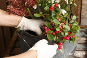 華やかな赤い実をつけるチェッカーベリーを使うと、寄せ植えが豪華に仕上がります。秋に実をつけ、3月頃まで実が長くもつので、秋の実りの季節、クリスマスやお正月の寄せ植えや生花のアレンジにぴったりです。