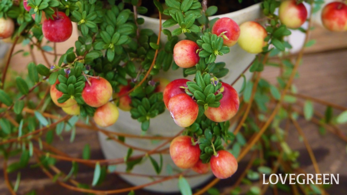 コケモモ(リンゴンベリー)は、耐寒性が非常に高く、冬も常緑を保ちます。酸性土壌を好み、痩せ地でもよく育ちます。一方、夏の高温多湿には弱いので、日本の暖地の平野部で地植えにするのは難しい植物です。大きくならないため、鉢植えで管理し、冬、春、秋は日当たりの良い場所、夏は風通しの良い半日陰に移動させるとよいでしょう。