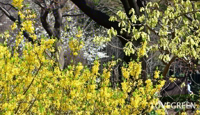 レンギョウ(連翹)には、レンギョウ、シナレンギョウ、チョウセンレンギョウなど、いくつかの種類があります。公園などに植栽され、苗木として流通しているのはレンギョウ、シナレンギョウ、チョウセンレンギョウ、それらを交配した園芸種などが多いようです。種類によって葉が出るタイミングが違うため、開花時に一面黄色になるものと緑が混じるものに分かれ、全体として見ると趣が違います。