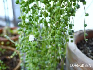 グリーンネックレスは、グリーンのボールが連なったような見た目がかわいらしい多肉植物。ボールのように見えるのは葉で、この中に水分を蓄えています。葉を楽しむ観葉植物ですが、秋~冬に小さな白い花を咲かせます。