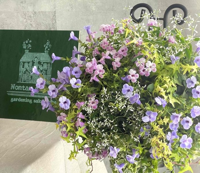 確かに少し迷いましたが、植物好きのおうちというのは独特のオーラがあるもの。遠目に見えたパンジーの寄せ植えにピン!ときて近づいていくと、「NONTAN GARDEN」と書かれた看板を発見。中本さんの庭兼ワークショップを行うご自宅です。名前の由来は愛猫の「ノンタン」から。