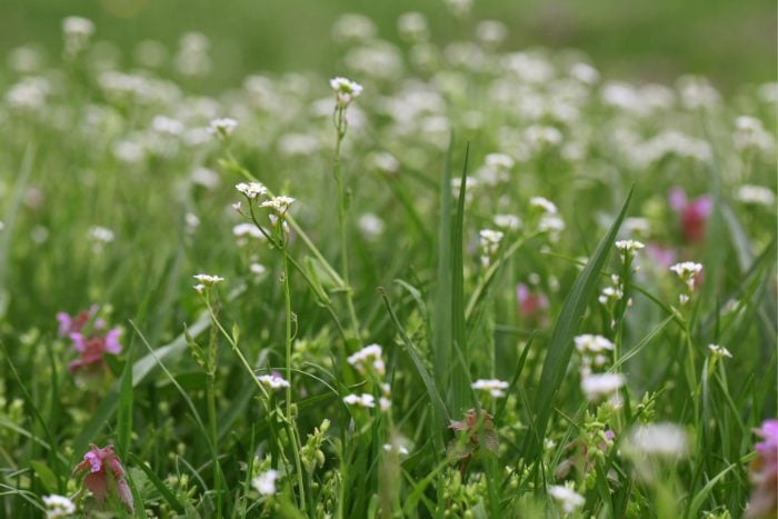 カラスノエンドウ、ホトケノザ、ハハコグサ、オランダミミナグサ、タネツケバナ、スズメノカタビラ、ハルジオンなど。